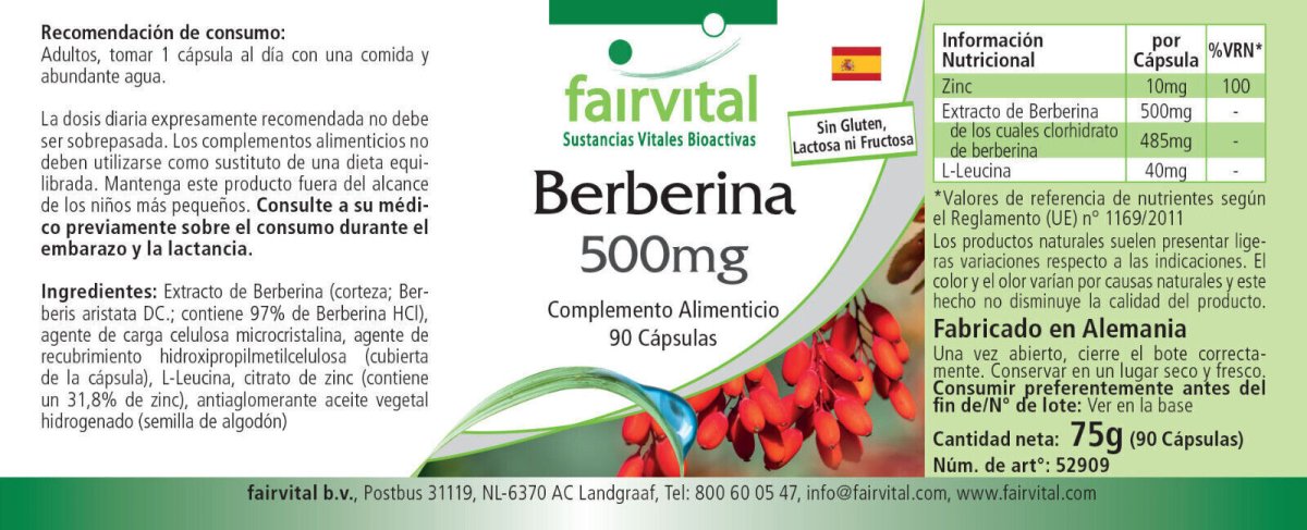 Este complemento alimenticio contiene una sustancia muy valiosa: el clorhidrato de berberina, estandardizado por un 97% de contenido de berberina. Este valor corresponde a una dosis díaria de 485mg de berberina por cápsula.