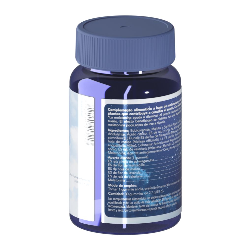 Por 1 gummie: 27 mg ES raiz y hoja de ashwagandha, 20 g ES de flor de manzanilla, 27 mg ES de hoja de melisa, 27 mg ES de flor de lavanda, 7 mg ES de raíz de valeriana y 1 mg melatonina