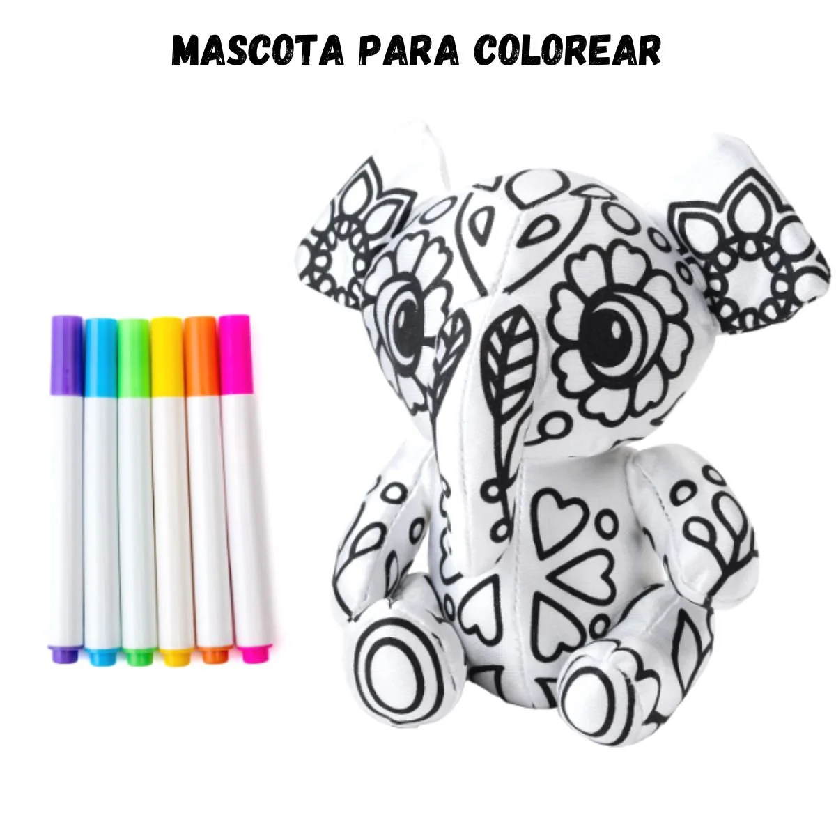 Con este kit podras colorear un hermoso elefante de felpa ya impreso. Trae distintas formas para que puedas iluminarlo con los plumones permanentes que incluye.