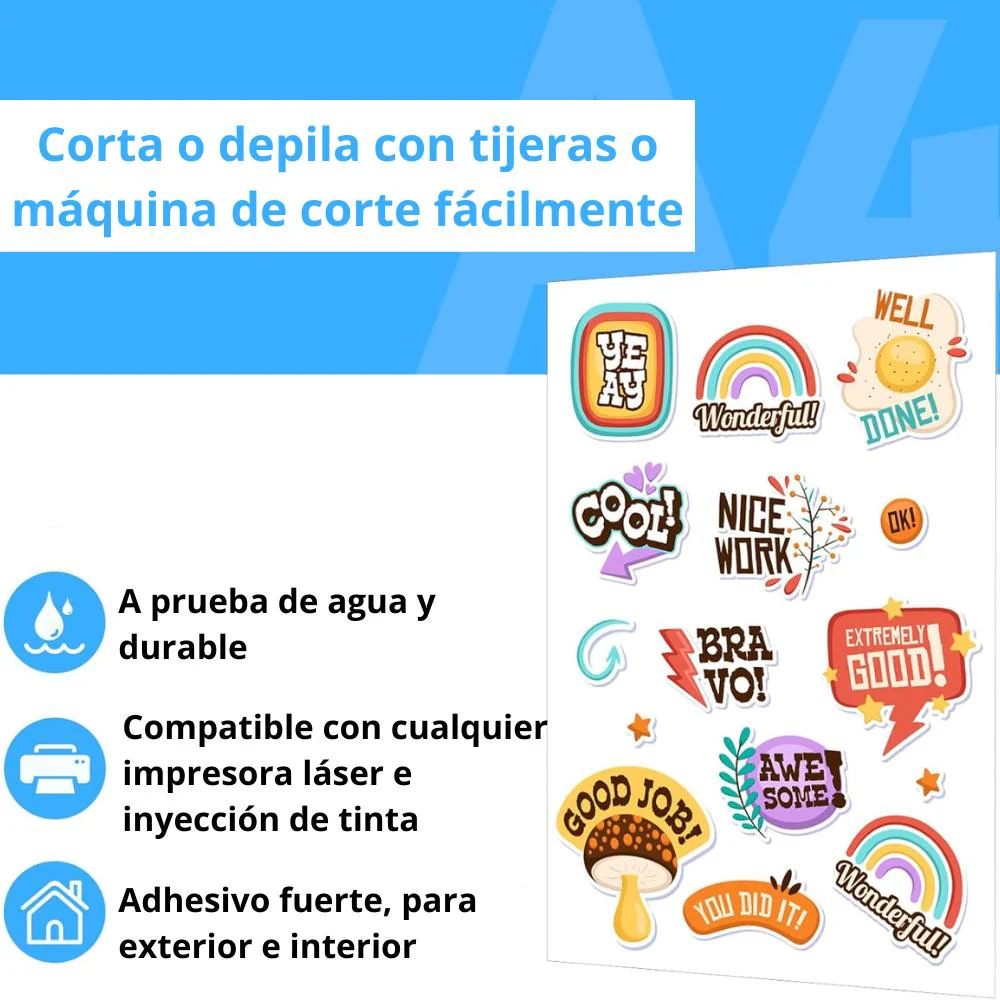 Este papel adhesivo de vinilo imprimible por inyección de tinta en un tamaño estándar de 8.26 x 11.69 pulgadas se puede utilizar para impresoras láser o impresora de inyección de tinta, especialmente mejor para impresoras de inyección de tinta. También es compatible con todos los cortadores de manualidades y fácil de cortar con unas tijeras.