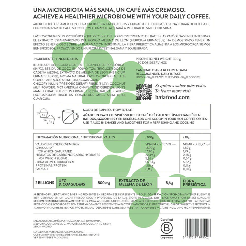Nuestro Microbiotic Creamer contiene, además de los prebióticos y probióticos, extracto del hongo Melena de León. Este extracto posee β-glucanos (una fibra soluble) procedente de la pared celular de las setas.