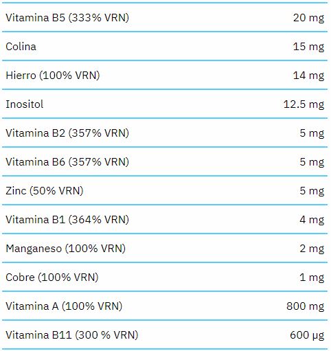 Aceite de onagra, vitamina C, magnesio, vitamina B3, calcio, vitamina E, extracto de cimicifuga, extracto de Agnus castus, extracto de té verde, extracto de cola de caballo, bioflavonoides (cítricos), vitamina B5, colina, hierro, inositol, vitamina B2, vitamina B6, zinc, vitamina B1, manganeso, cobre, vitamina A, vitamina B11, vitamina K, biotina, selenio, yodo, cromo, molibdeno, vitamina B12, y vitamina D3.