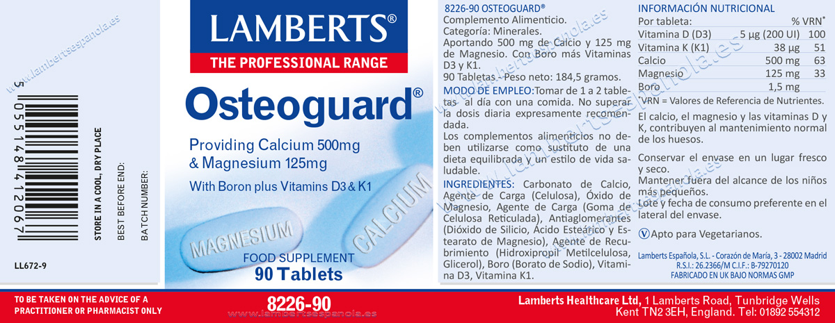 Osteoguard® de LAMBERTS® es una fórmula de la salud ósea Todo-en-Uno que contiene altos niveles de calcio y magnesio, junto con boro y vitaminas D y K. Aunque una tableta al día constituye un buen soporte para la mayoría de las dietas, dos tabletas al día son preferibles para aquéllos cuya dieta contiene pocos productos lácteos, o para las mujeres en edad de la menopausia. Osteoguard®, es una pareja excelente para la mayoría de las fórmulas múltiples.