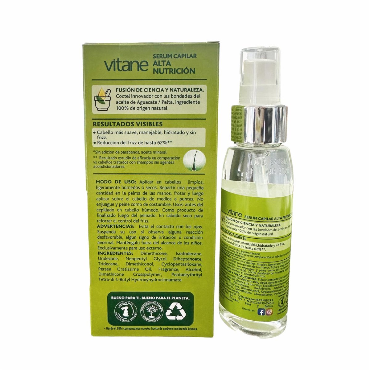 Nutre, hidrata y protege tu cabello con el nuevo Sérum Capilar Alta Nutrición de Vitane. Su fórmula con aceite de aguacate y serum termoprotector hidrata profundamente, controla el frizz y protege del calor*, dejando el cabello suave, brillante y sin sensación grasosa. Modo de empleo: Úsalo sobre el cabello limpio, húmedo o seco. Aplica una pequeña cantidad en las manos, frota y distribuye de medios a puntas, enfocándote en las zonas más secas