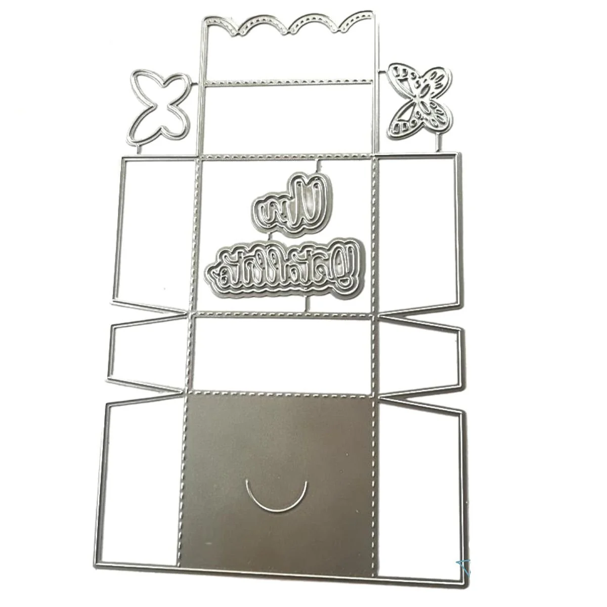 - 7 suajes: cajita 22.3 x 13.9 cm, 2 mariposas (fondo y calada) 2.2 x 3 cm , 2 palabras: Un 2.6 x 2 cm, Detallito 5.8 x 1.6 cm (sombras +0.5 mm aprox) La cajita armada mide mide 6.6 x 3.3 x 7.2 cm