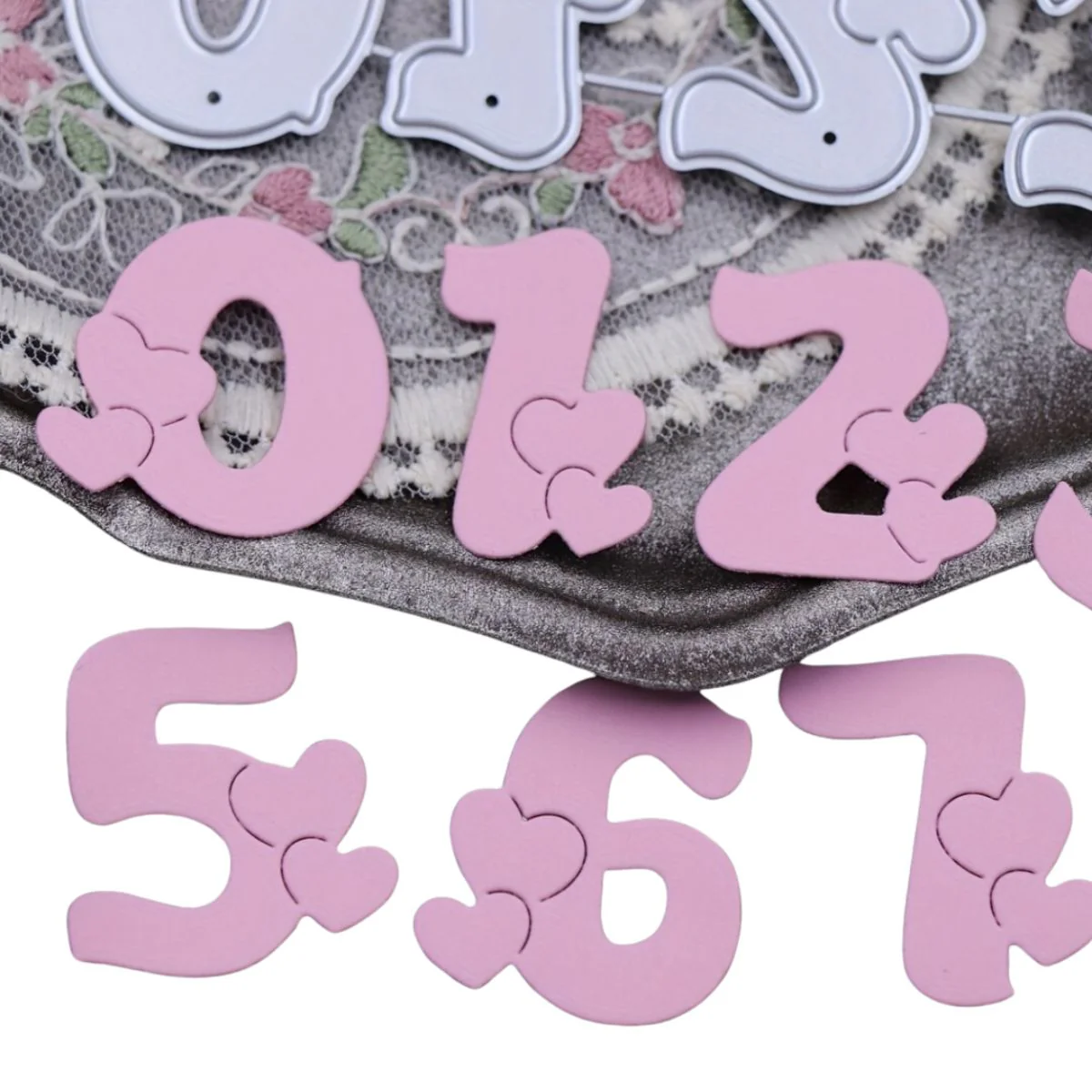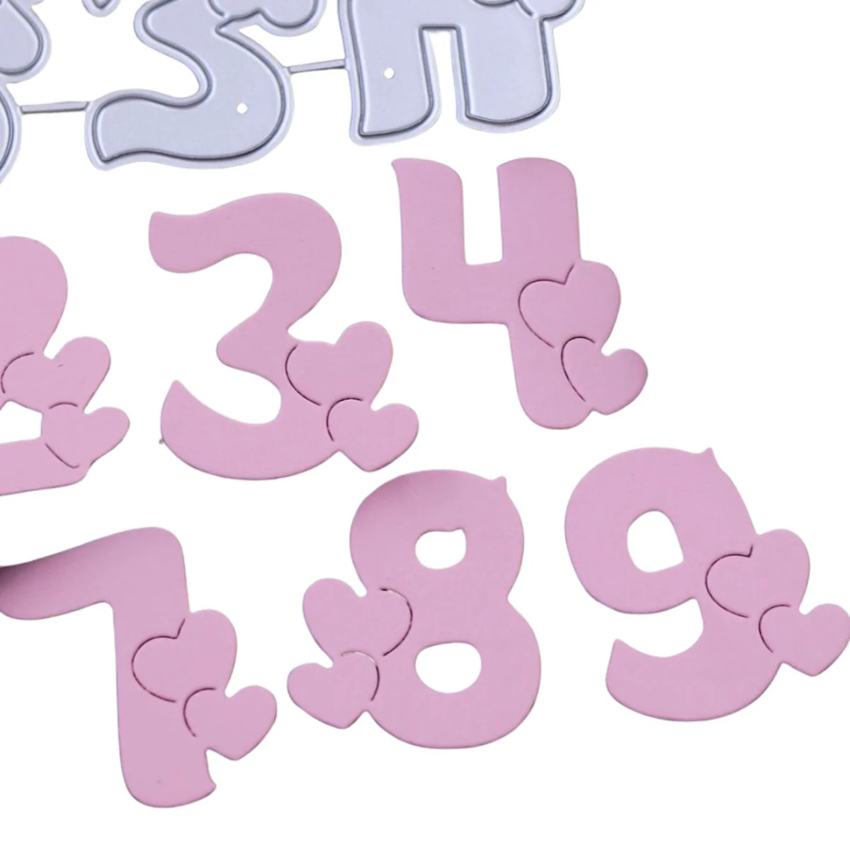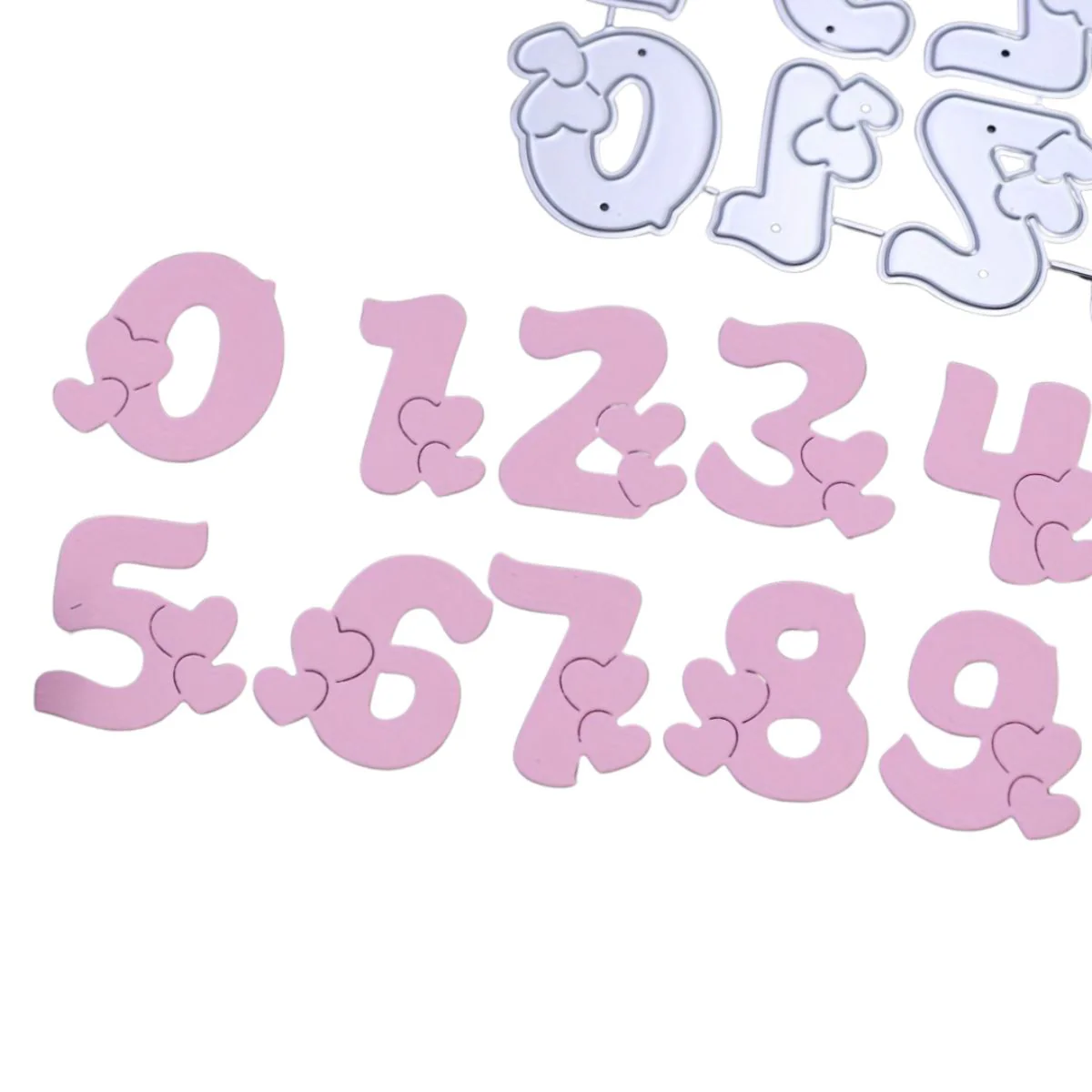 - 10 suajes o troqueles de letras con corazones que miden aproximadamente 3 cm de altura cada número