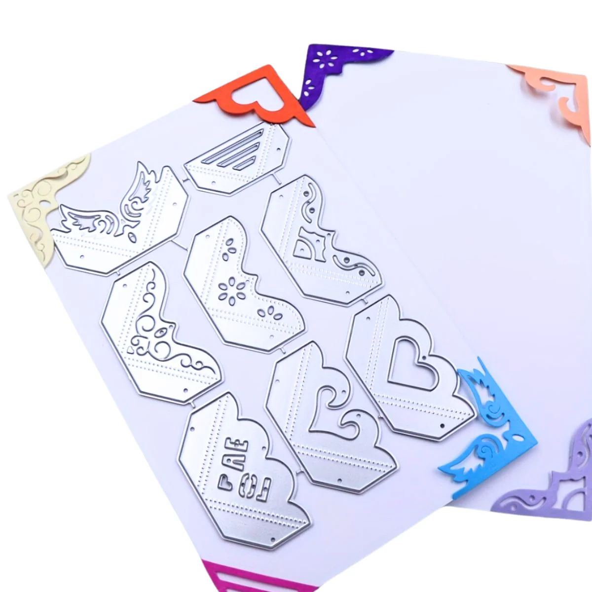 - 8 suajes de esquina decoradas que miden 3.8 cm x 3.8 cm cada una aprox.