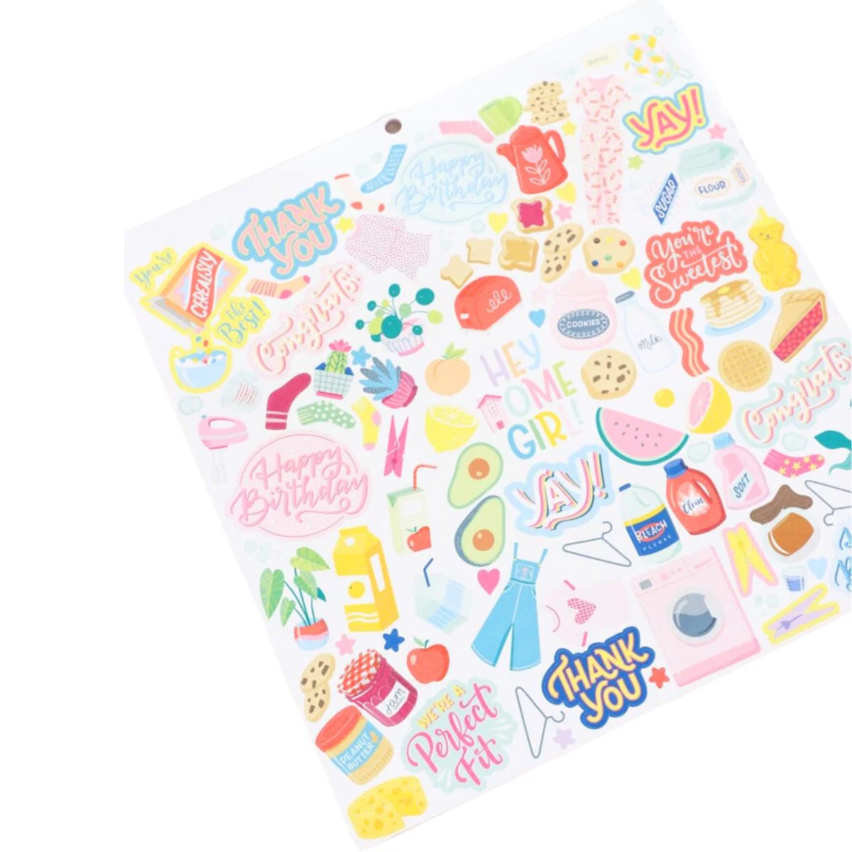 ¡El Project Pad es un producto estrella de esta colección! ¡Incluye un montón de elementos útiles que te mantendrán trabajando durante horas! En la parte delantera del bloc de proyectos, encontrarás dos páginas completas de pegatinas que incluyen alfabetos, envoltorios de sobres y más. Dentro del bloc de proyectos, encontrarás papel estampado junto con hojas perforadas de efímeras que incluyen tarjetas con formas como esa adorable tostada con tocino y huevos encima. ¡Solo saca la tarjeta y comienza a decorar con todas las demás piezas perforadas!